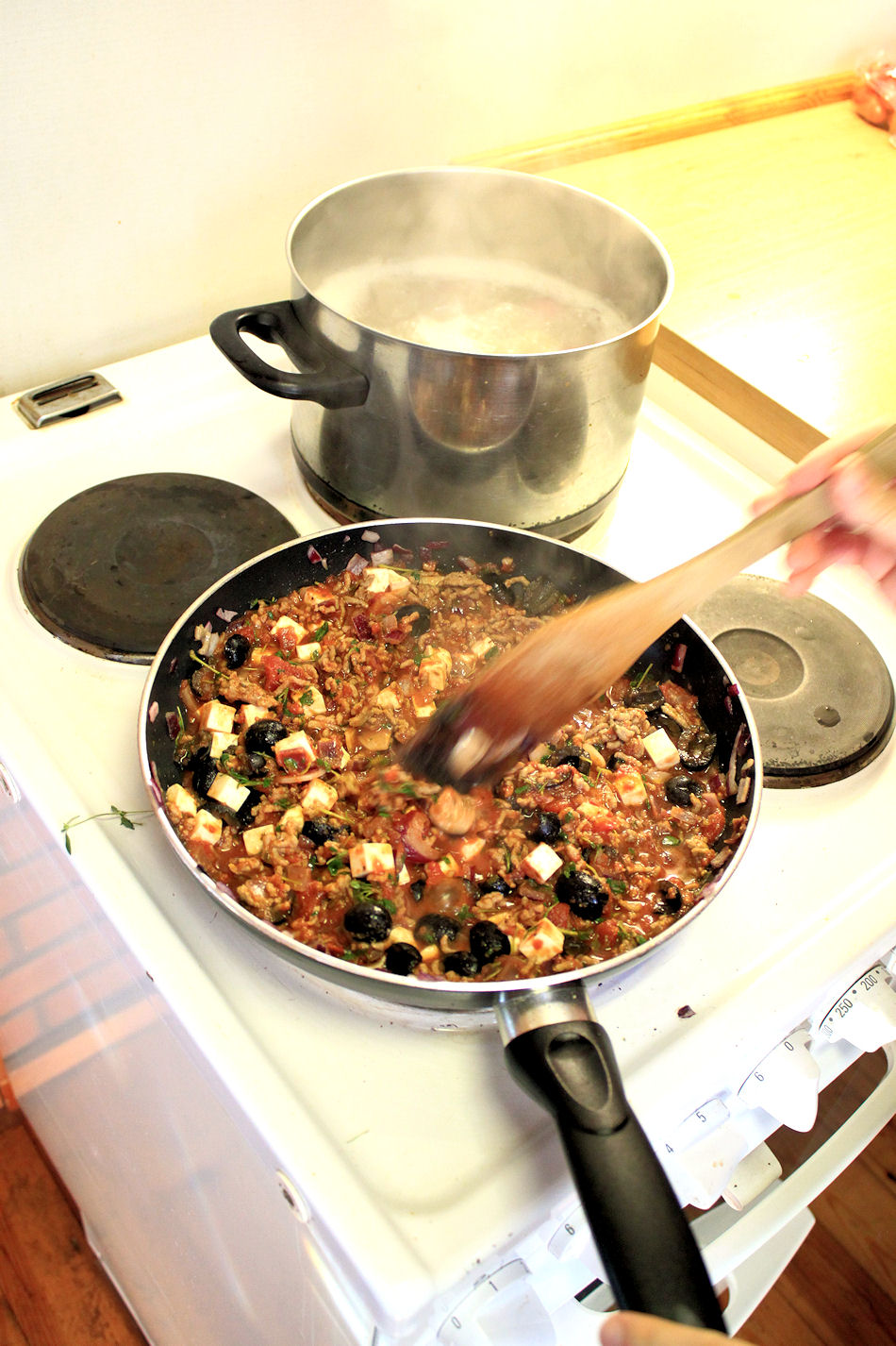 Pieniksi hakatut sipulit ja puristetut valkosipulinkynnet kuullotetaan öljyssä pannulla. Lisätään joukkoon lampaan jauheliha ja ruskistetaan se. Kaikki muut aineet lisätään ja haudutetaan. Feta sulaa seokseen, joten muutaman kuution voi jättää odottamaan ja lisätä pataan ennen muusin laittamista päälle.