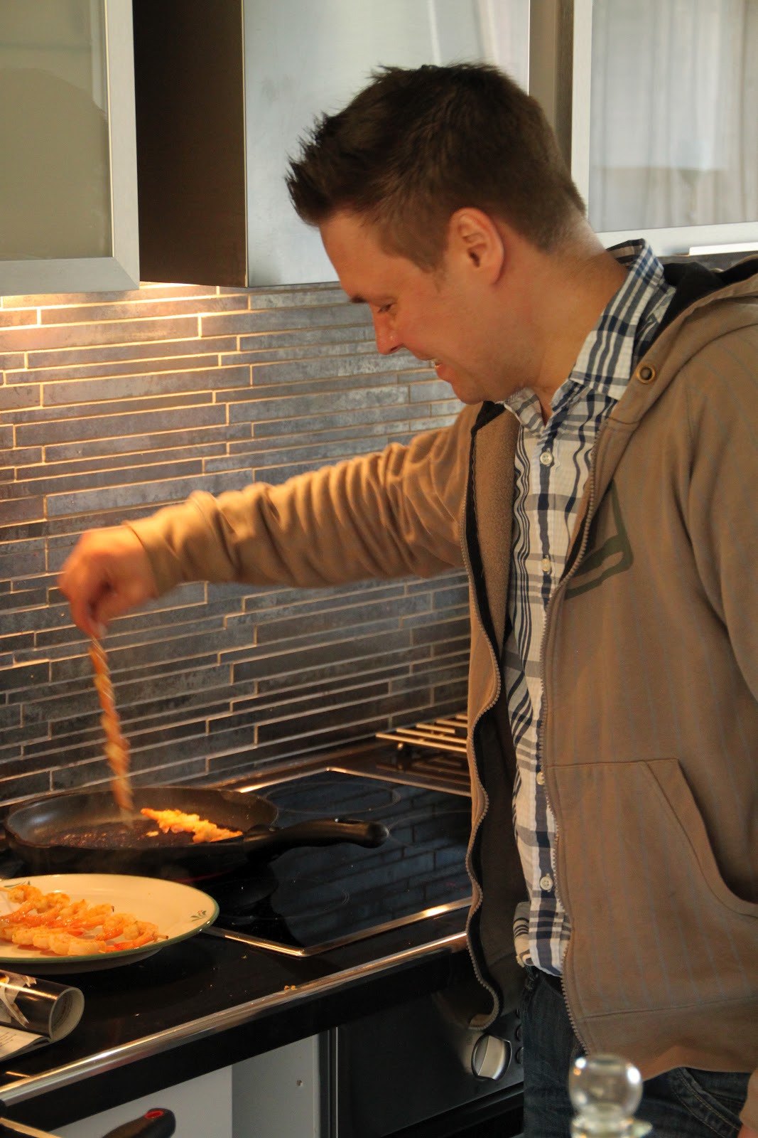 | Rapumestari hommissa. Tällä kerralla ei grillattu rapuja, vaan laitettiin parillapannulla. |