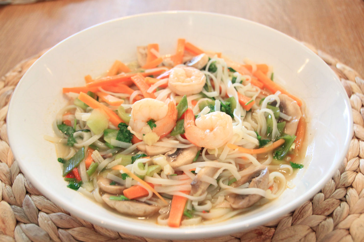 - Laita ravut ja valutetut nuudelit keiton sekaan. Mausta limen mehulla, sokerilla, suolalla ja pippurilla.