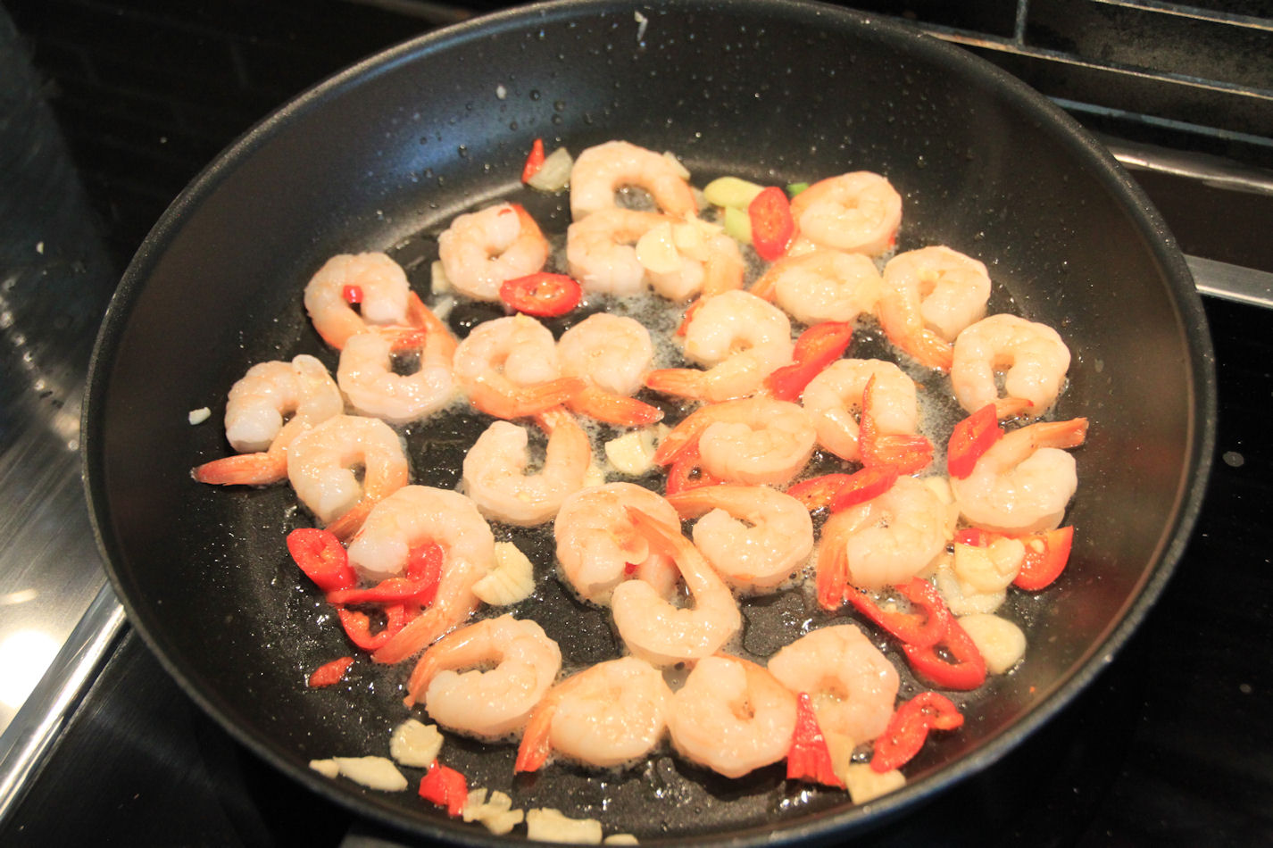 - Kuori ravut (jos ei ole valmiiksi kuorittuja) ja poista musta suoli veitsenkärjellä (jos ei ole valmiiksi poistettu). Pilko valkosipuli. Puhdista chili, poista siemenet ja silppua. Paista valkosipulia, chiliä ja rapuja kevyesti öljyssä. Jos ravut ovat valmiiksi keitettyjä, niin kuumenna vain tosi nopeasti.