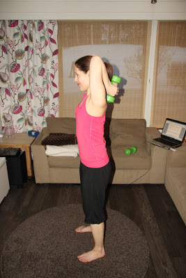 Seiso ryhdikkäästi pitäen käsipainosta kiinni molemmilla käsillä. Nosta kädet pystyyn pään viereen. Koukista käsiä kyynärpäistä ja laske käsipaino pään taakse. Ojenna kädet takaisin ylös ja jännitä olkavarsien ojentajalihaksia. Pidä olkavarret paikoillaan koko liikkeen ajan.