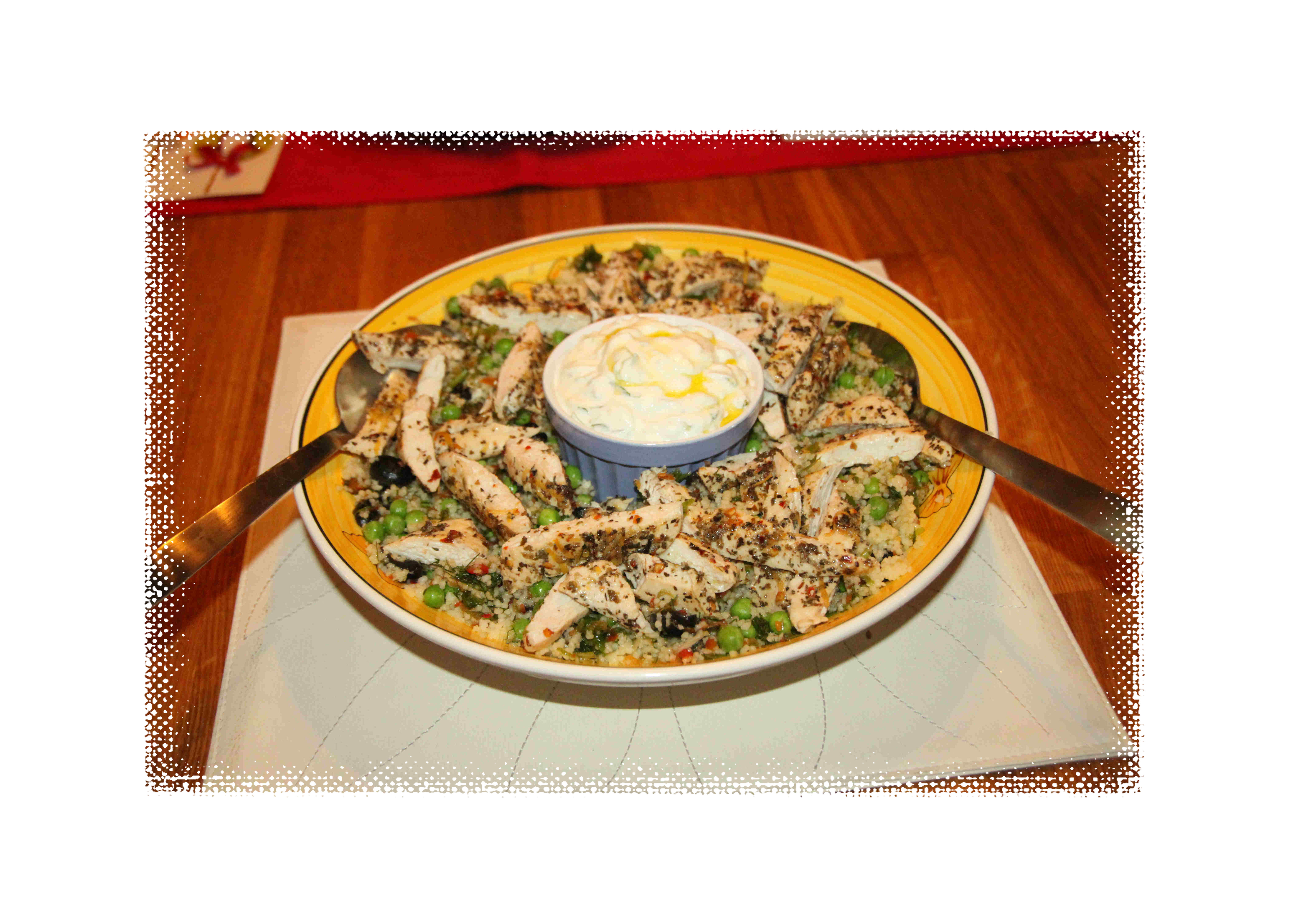 Poista paprikoista ja chilistä kannat ja siemenet, ja hienonna tehosekoittimesssa (tai sauvasekoittimella) yhdessä pilkottujen kevätsipuleiden ja tillin kanssa. Levitä laakealle vadille. Lisää päälle herneet, revityt oliivit, puristettu sitruunanmehu, sekä neitsytoliiviöljy. Lisää joukkoon cous cous, maistele ja mausta tarvittaessa lisää. Paloittele kypsä kana ja levitä cous cousin päälle. Ripottele pinnalle fetajuustoa ja tarjoile tsatsikin kera.