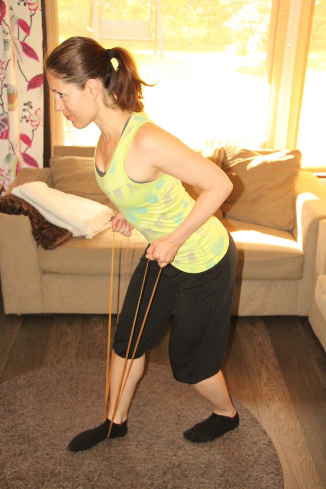 Astu kuminauhan solmukohdan päälle toisella jalalla. Ota kuminauhalenkkien päistä kiinni käsillä. Koukista hieman polvia ja kallista selkää eteenpäin. Vedä kuminauhan päitä kohti vatsaa koukistaen kyynärpäät. Kiinnitä huomio lapaluihin ja vedä niitä kohti toisiaan. Palauta kuminauha hitaasti takaisin alas. Pidä selkä suorana koko ajan!