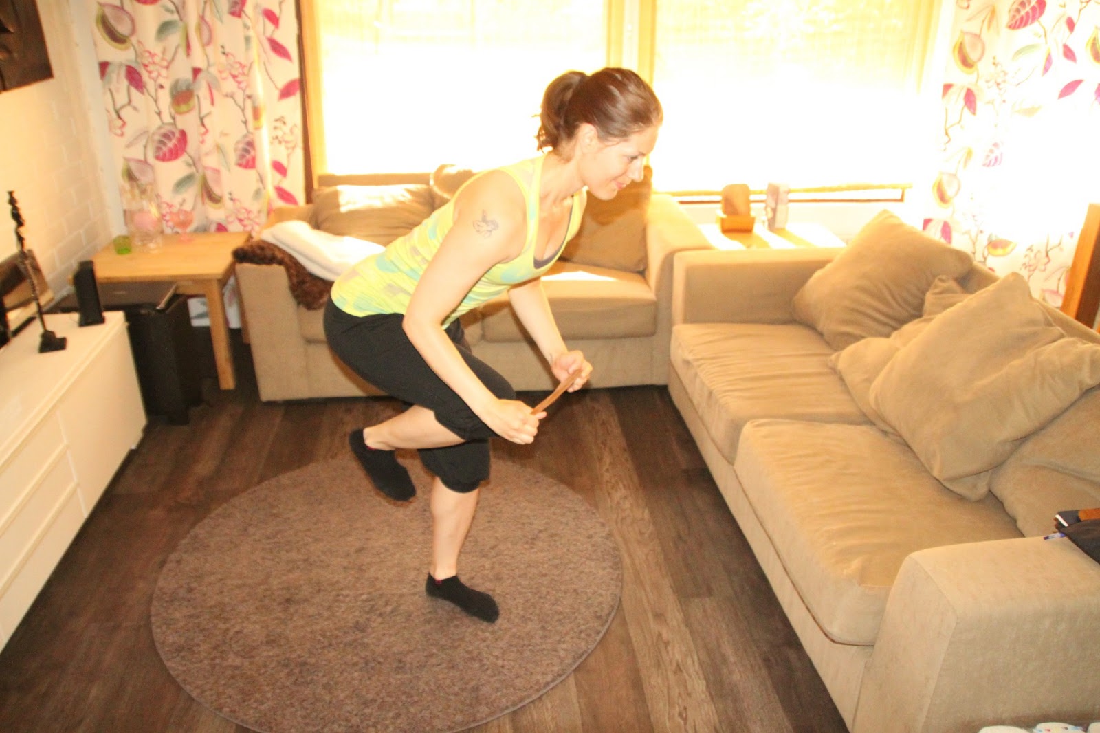 Käytin tässä jumpassa kahta ruskeaa kuminauhalenkkiä, jotka on sidottu toisiinsa kiinni siten, että solmukohta on keskellä. Harjoitteet onnistuvat myös erilaisilla kuminauhoilla.