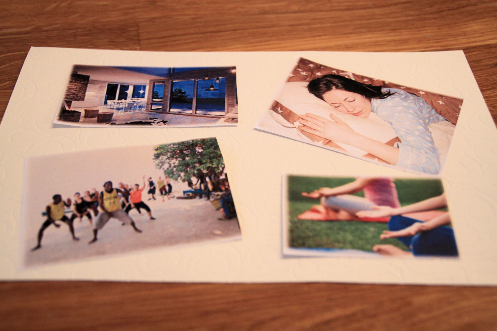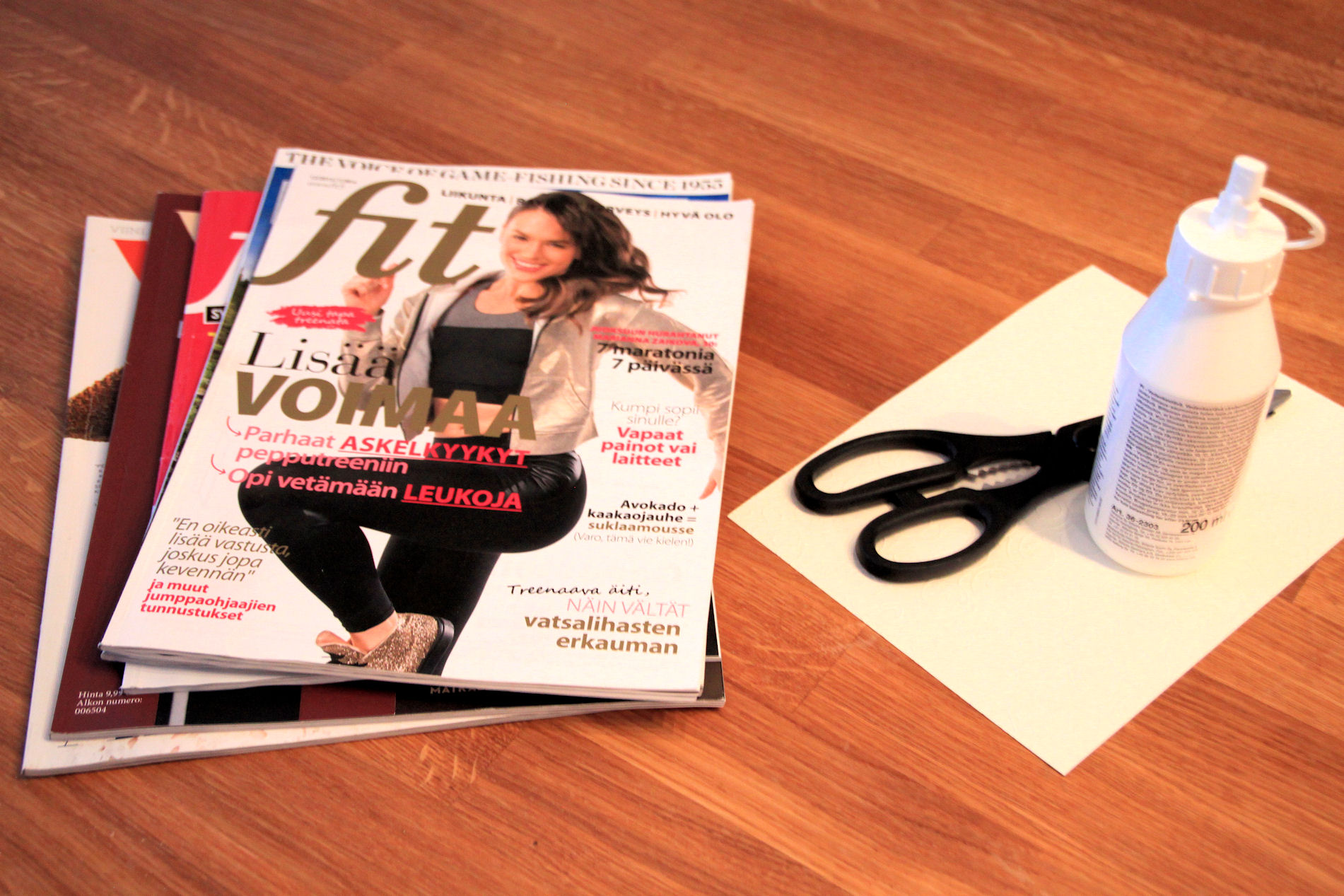 Tarvitset kartonkia, sakset, liimaa, sekä aikakauslehtiä, joista voit leikata kuvia. Tai jos mieluummin piirrät tai kirjoitat unelmasi, tarvitset vain kynän ja paperia. (Mulla ei nyt ollut lehtiä, joten etsin sopivat kuvat netistä ja printtasin ne, mutta lehtien selaaminen oli mukavampaa puuhaa.)