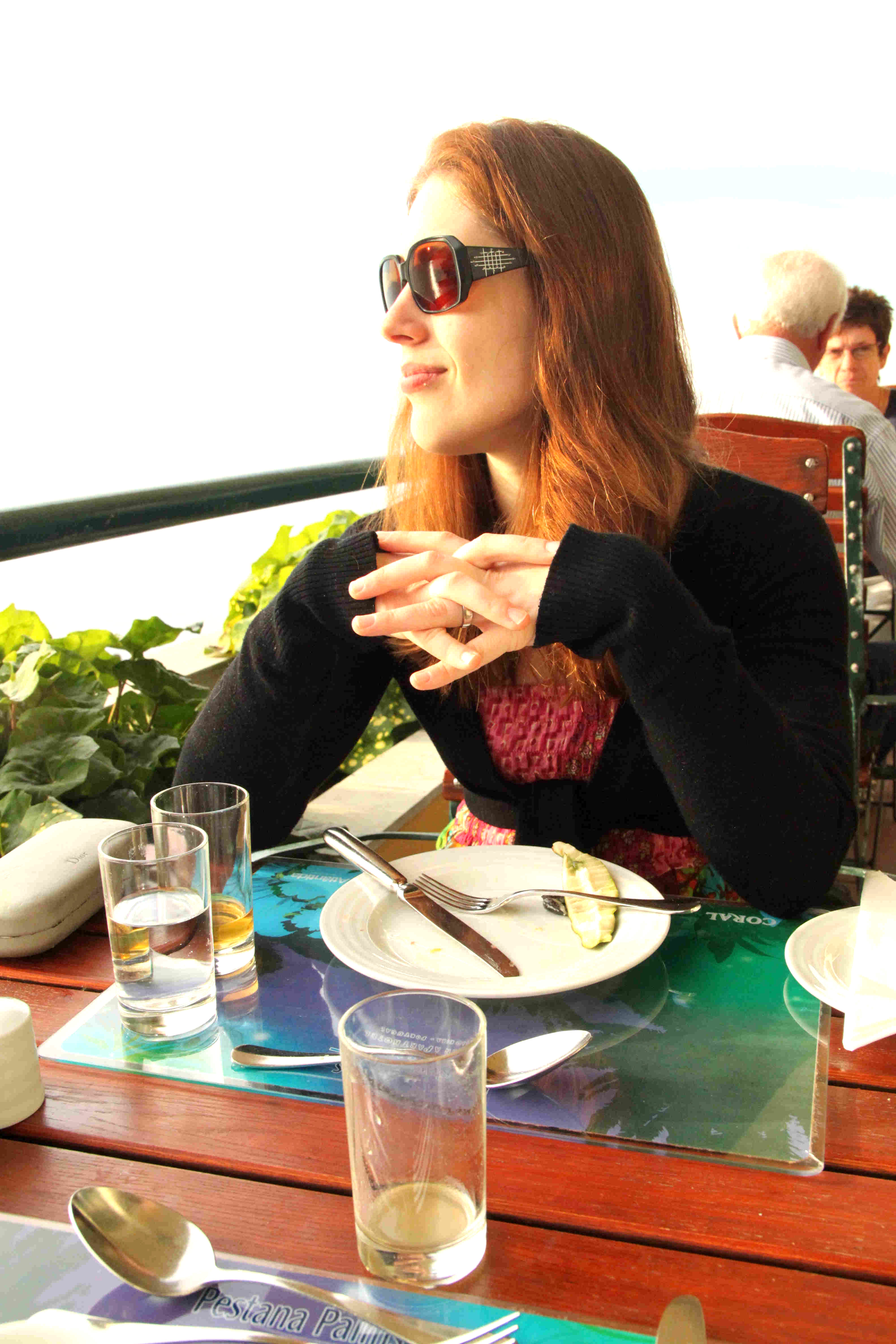 Aamiainen aamuauringossa merinäköalalla.