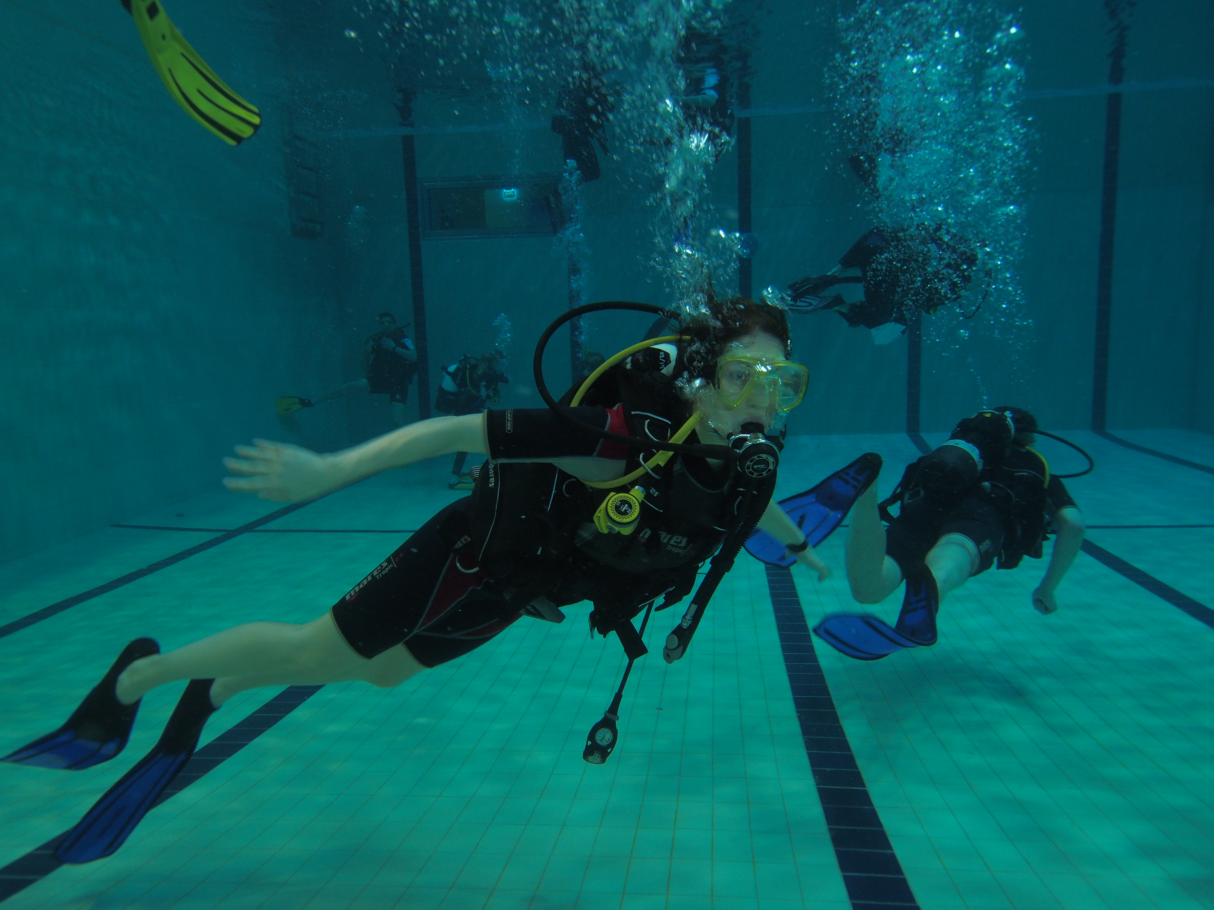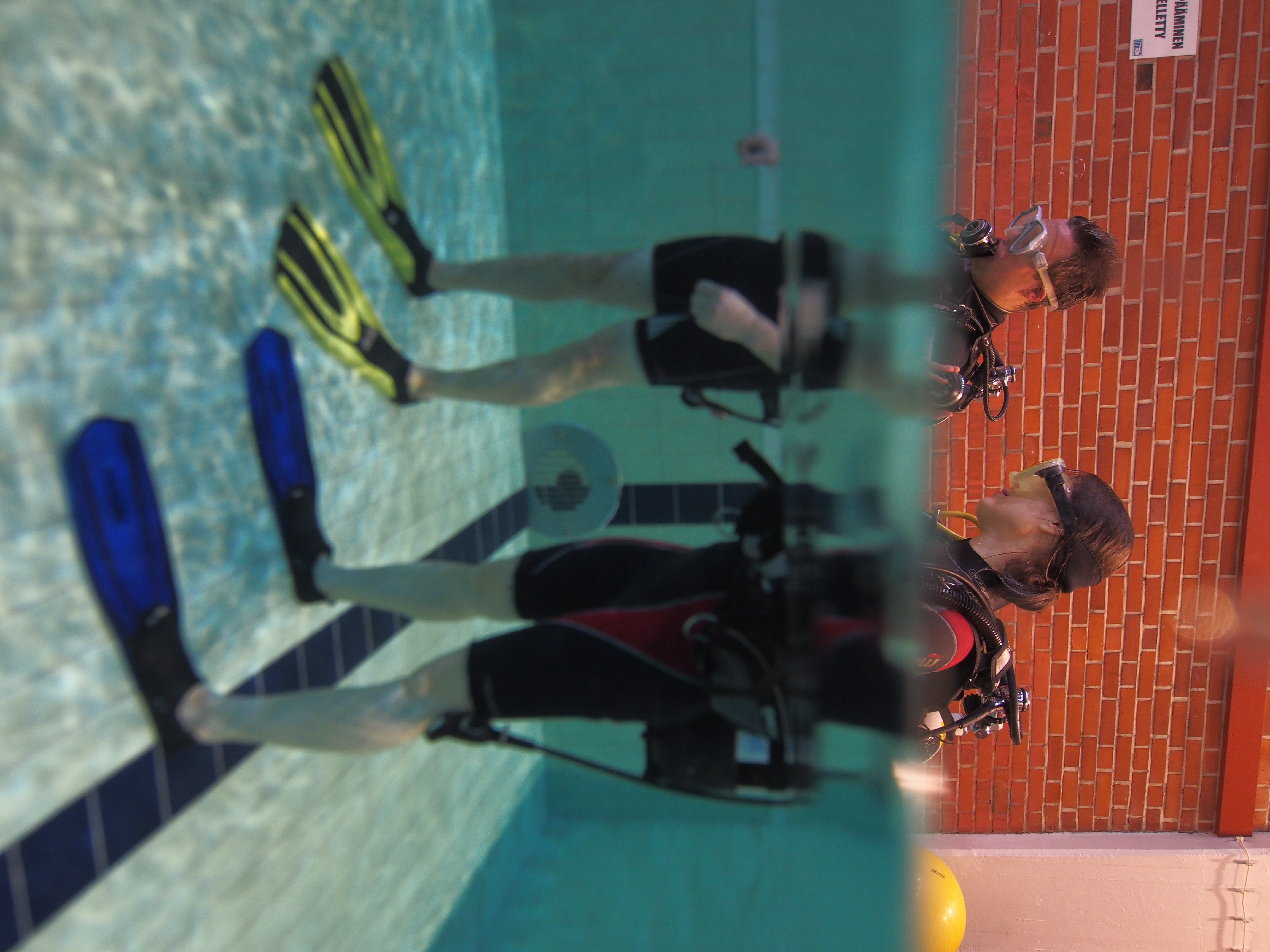 Totuteltiin matalassa päässä hengittämiseen veden alla ja opeteltiin muita turvallisuusjuttuja. Huomasin, että en olekaan peloissani, vaan innoissani. Hengittäminen vedessä regulaattorin avulla olikin helppoa. Turvallisuuden tunnetta lisäsi se, että oltiin pienissä kolmen henkilön porukoissa, ja jokaisella porukalla oli oma ohjaajansa, ja tietenkin se, että oltiin allasolosuhteissa kirkkaassa vedessä.