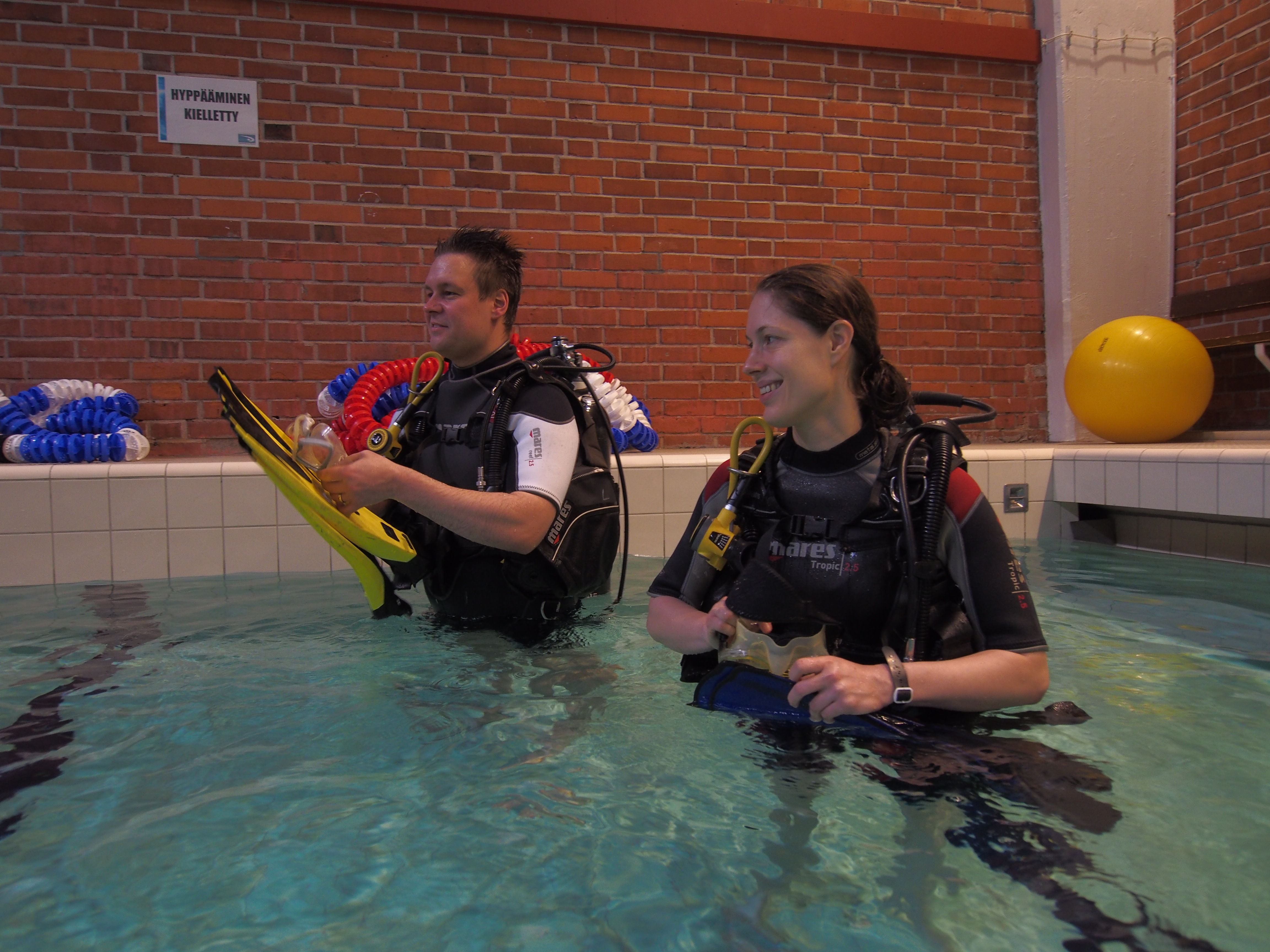 Arastellen saavuin paikalle, mutta oloa helpotti se, että muutkin kokeilijat olivat ensikertalaisia ja sukelluskeskuksen porukka loi mukavan ja rennon tunnelman. Aluksi käytiin lyhyesti läpi teoriaa, ja homma vaikutti ihan simppeliltä. Sitten suihkun kautta altaalle. Survoin märkäpuvun päälleni, ja olo oli kuin liian pienessä makkarankuoressa. Seuraavaksi vyötärölle laitettiin painovyö ja sitten puettiin tasapainotusliivit, joihin oli kytketty happisäiliöt ja tarvittavat letkut. Painava liivi harteilla tallusteltiin veteen ja tässä vaiheessa tuntui, että olen tonnin painava tankkeri, joka saattaa kömähtää kumoon hetkenä minä hyvänsä. Pääsin kaatumatta altaaseen, ja painon tunne hävisi.