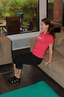Aseta penkki seinää vasten liukumisen estämiseksi. Laita kämmenet penkille sormet eteenpäin. Pidä jalat lattialla tai toisella penkillä. Laske lantio alas koukistamalla kyynärpäät 90 asteen kulmaan.