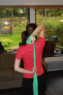Nappaa kuminauhan molemmista päistä kiinni. Tuo toinen käsi selän taakse. Ojenna toinen käsi ylös vartalon jatkeeksi. Pidä kyynärpää pään lähellä. Palauta käsi takaisin lähtöasentoon, nyrkki niskan taakse. Säilytä hyvä ryhti liikkeen aikana ja paina hartioita alas.