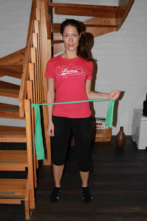 Seiso ryhdikkäästi kuminauhan toinen pää jalan alla ja toinen vastakkaisen puolen kädessä. Nosta käsivarsi sivulle hartioiden tasolle ja palauta jarruttaen alas. Pidä ranne suorassa linjassa kyynärvarren kanssa. Kyynärnivelessä on loiva koukku, jolloin rystynen osoittaa eteenpäin.