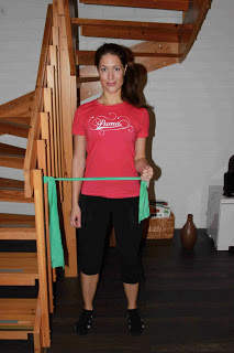 Aseta kuminauha molempien tai toisen jalan alle. Nappaa kiinni nauhan molemmista päistä. Koukista kyynärnivelet ja vedä kuminauhaa kohti kainaloita siten, että peukalo johtaa liikettä. Palauta jarruttaen takaisin alas.
