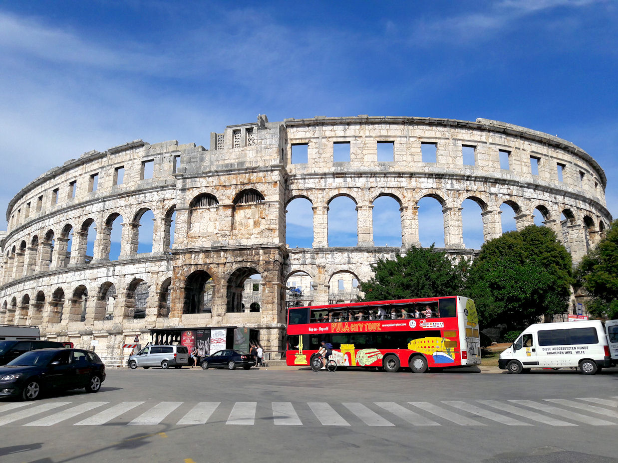 Kun olimme saaneet tarpeeksi auringosta, istahdimme ilmastoituun autoon ja päätimme tehdä vielä pikapyrähdyksen Pulaan. Ajelimme suoraan amfiteatterin viereen, josta sattui löytymään sopivasti parkkipaikka, kiersimme teatterin ulkoapäin ja piipahdimme pikaisesti Pulan vanhassa kaupungissa. Olisimme voineet kierrellä katuja vielä jokusen tunnin, muuta meillä oli jo kiire kentälle.