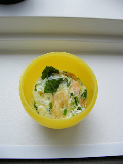 Proteiinit nappasimme kananmunista, jotka siskoni valmisti helpolla mikrokupilla. Muna rikotaan kuppiin, joukkoon lisätään mausteet ja annetaan olla mikrossa noin minuutti – ja voilá – valmista! Mausteena munissa oli kylmäsavulohta, juusto, tuoretta basilikaa ja ruohosipulia. Kyytipoikana kurkulla ja limellä maustettua vettä. Näillä päivä lähti hyvin käyntiin!