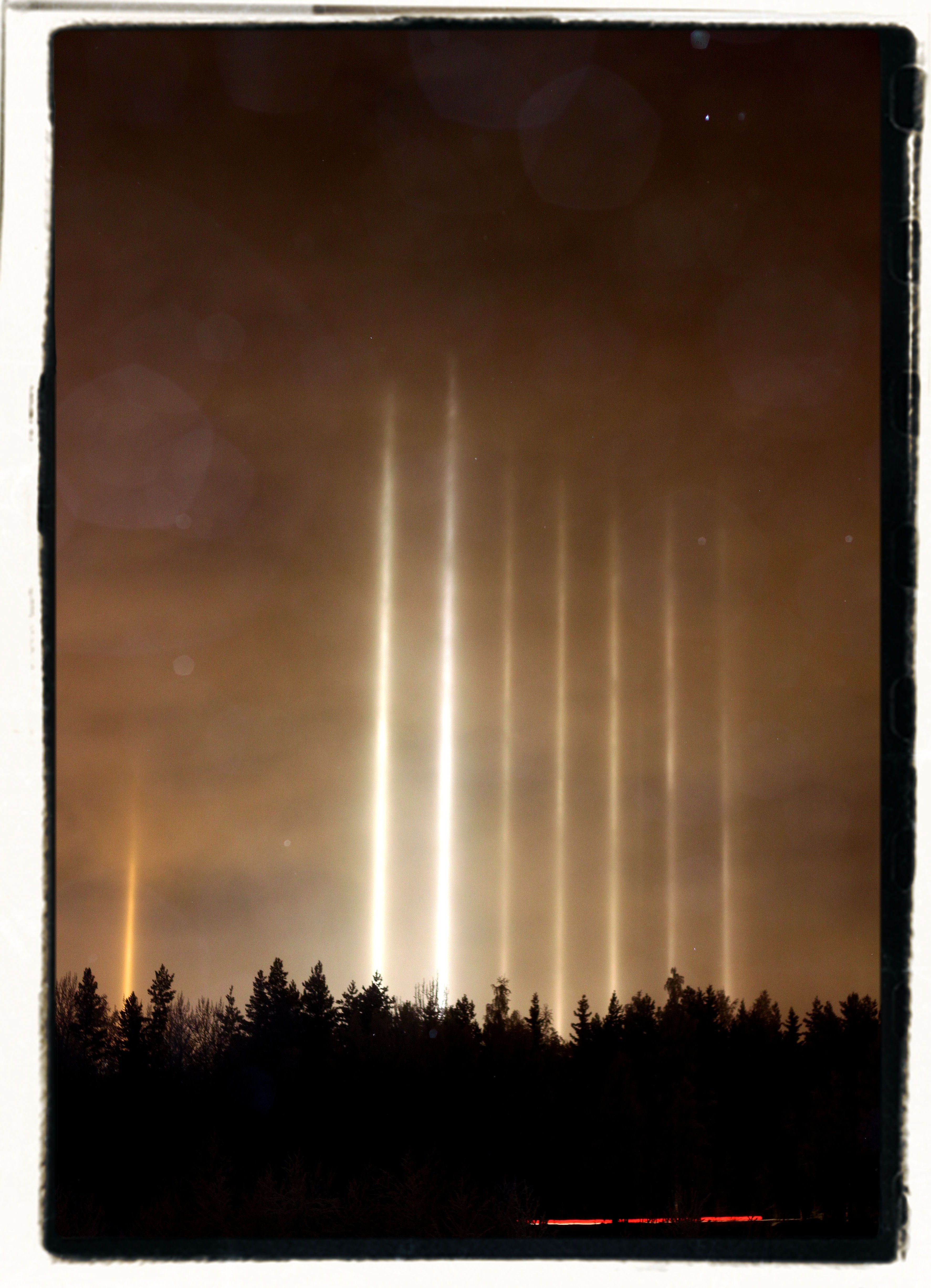 Alkuviikosta iltataivasta komistuttivat valopilarit. Luin netistä, että kyseessä oli haloilmiö, joka syntyy, kun katuvalon valo taittuu ilman jääkiteistä. Kide muodostaa eräänlaisen lasiprisman, joka taittaa valoa värillisiksi pylväiksi. Valopilareita voi muodostua, kun on suhteellisen kova pakkanen ja ilmassa on kosteutta.