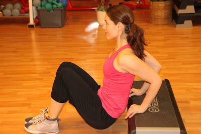 Aseta kädet takanasi olevalle laudalle sormet eteenpäin. Jalat ovat lattialla polvet ja lonkat koukussa. Koukista ja ojenna kyynärniveliä. Kyynärpäät osoittavat taaksepäin. Tunne liike käsivarren ojentajissa. Pidä keskivartalo tiukkana.