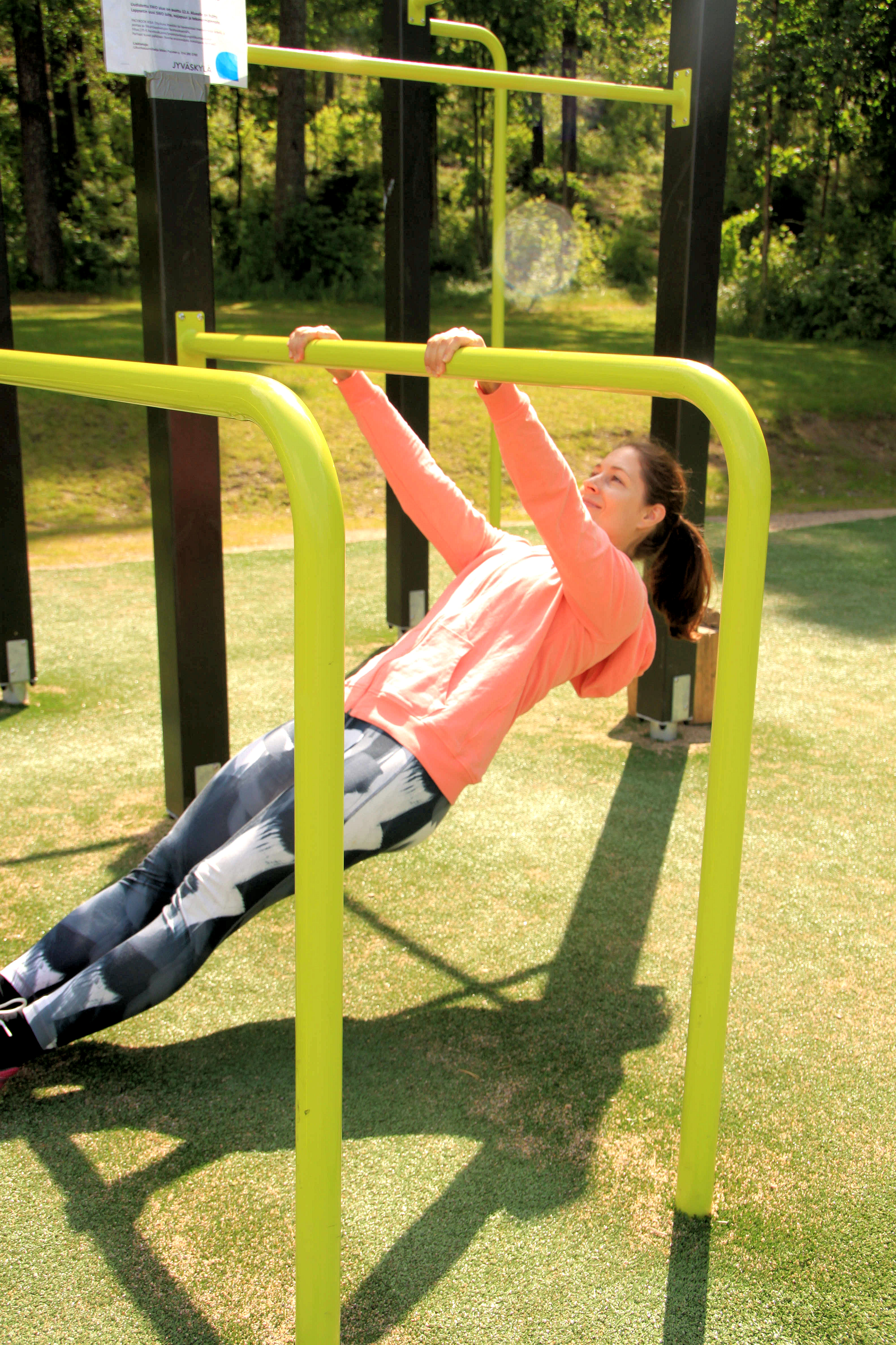 Tuomiojärven telineisiin oon tutustunut, kun oon nyt tänä kesänä käynyt muutaman kerran street workout –treeneissä.