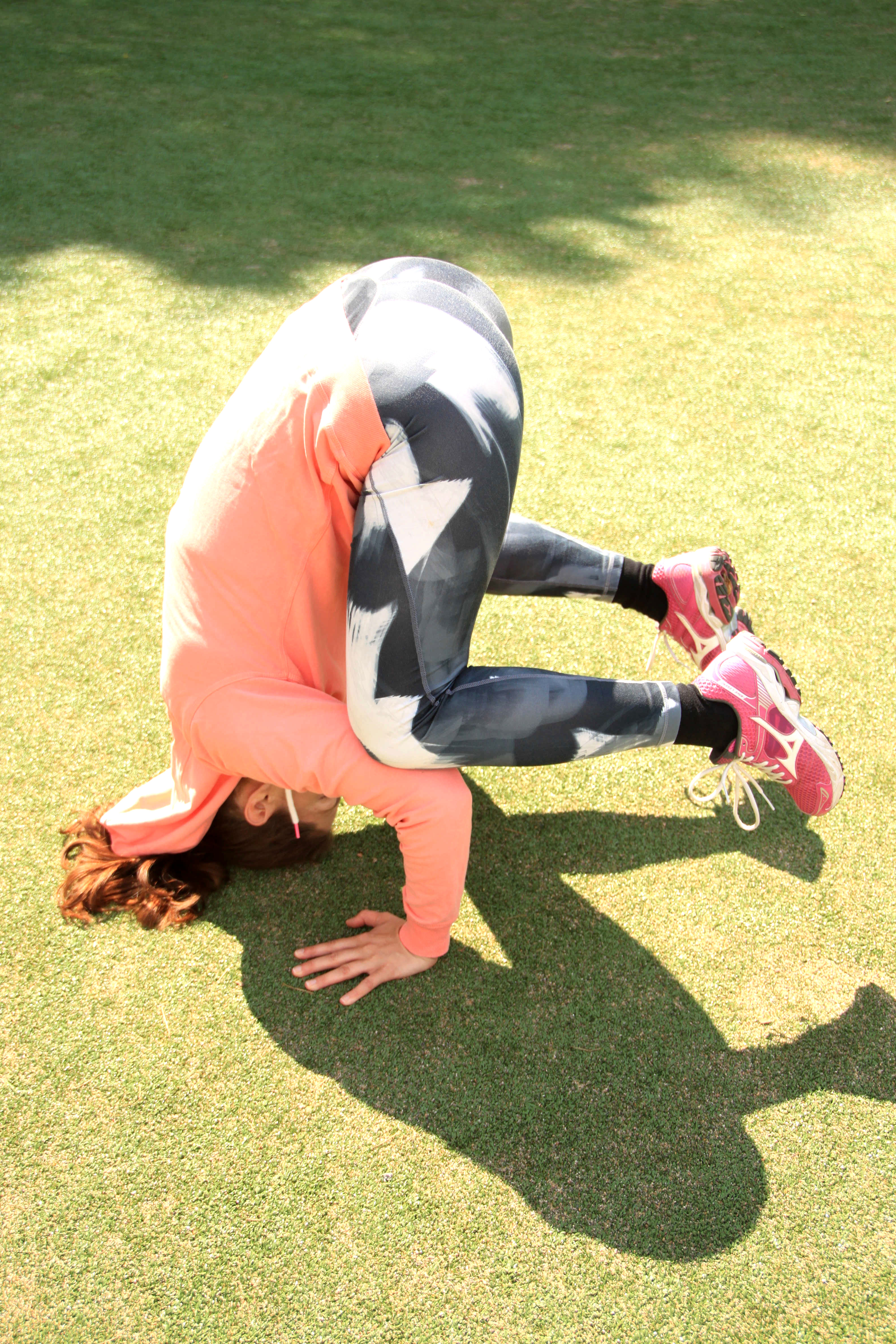 Tuomiojärven tekonurmialueella on hyvä harjoitella päälläseisontaa. Telineitä voi käyttää tukena. Yksi helpotettu versio on nostaa polvet tukemaan kyynärvarsiin. Siitä voi kokeilla ojentaa jalat ylös. Multa ei vielä onnistu. 😉