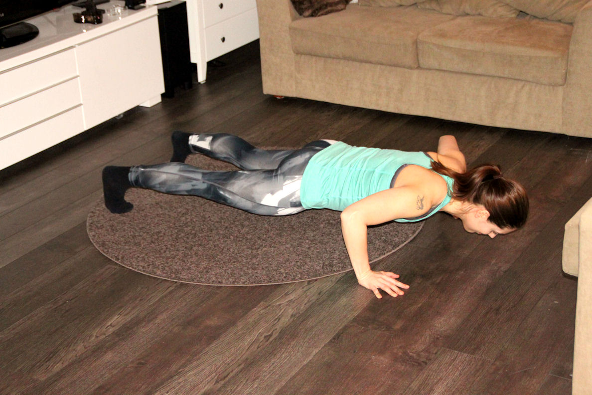 Punnerra vartalo alas koukistamalla kyynärpäitä. Pidä keskivartalo tiukkana. Punnerra takaisin ylös.