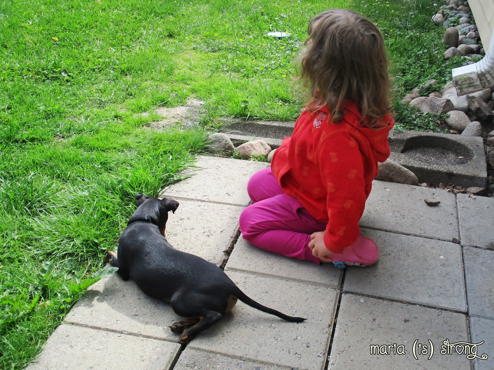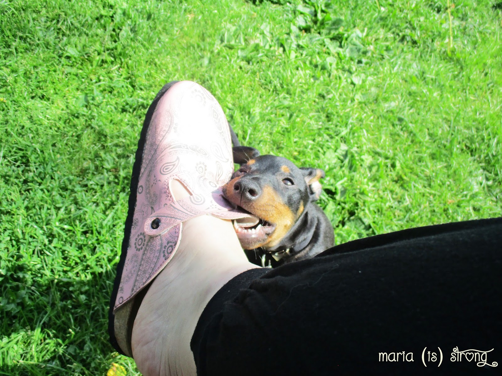 Bruce osaa istua ja mennä maate käskystä (tai enemmänkin makupalalla houkuttelulla). Pojun terrieriluonne kyllä tulee todella voimakkaasti esille välillä – kyse ei ole aina siitä, ettei pentu osaisi jotain, enemmänkin siitä, että se ei vain halua. Itsepäistä sorttia. Harjoittelussa on nyt vierellä kävely (heel) sekä ”leave/ drop)” (eli irti, lattialle jäänet sukat katoaa aika vilkkaasti purtavaksi) ja se ainainen pahis, eli kynsien leikkaaminen. Ja kyllä, koiralle opetetaan käskyt englanniksi. Pitäähän sen ENGLANNINkääpiöterrierin nyt omaa natiivikieltää osata sujuvasti 😄