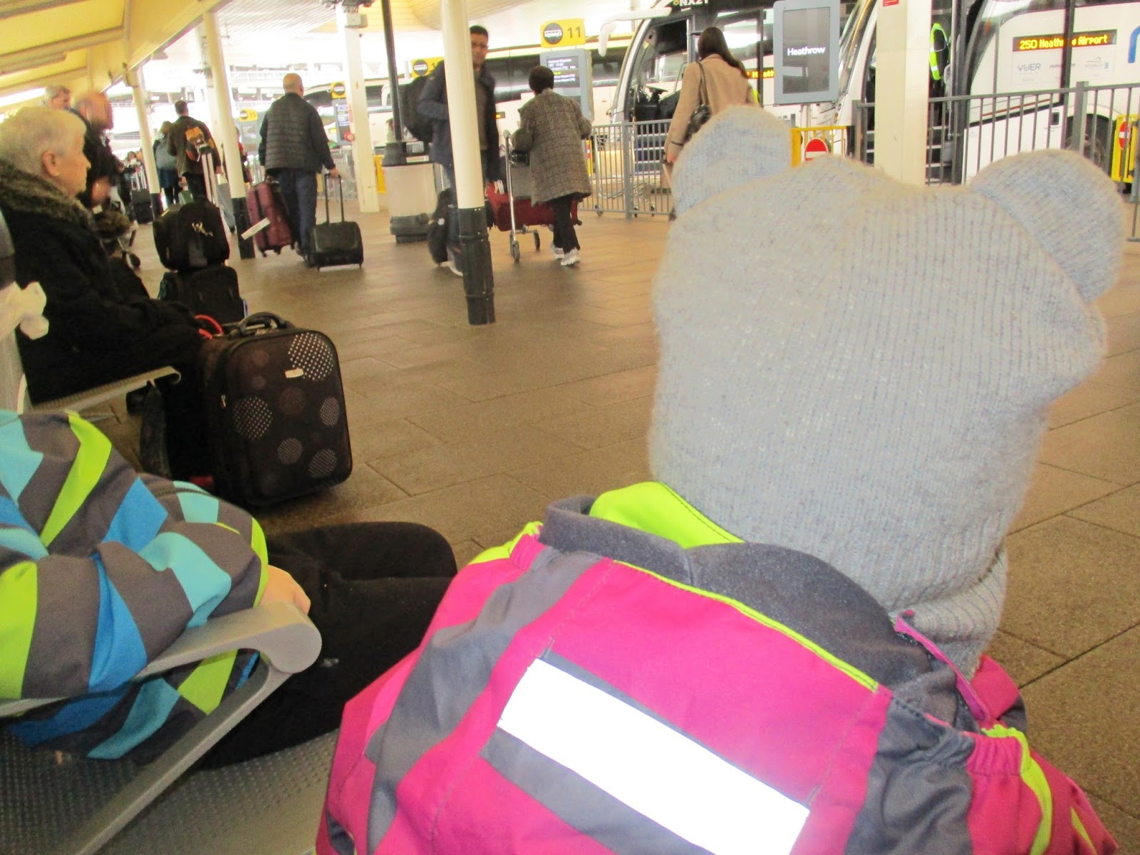 Paluumatkalla heräsimme aamukolmen aikaan. Väsyneet lapset ylös. Matkatavaroiden viimeinen ahtaus laukkuihin. Taksi ilmoittaa tekstiviestillä olevansa ulkona. Ei ollut, vaan parin korttelin päässä väärässä osoitteessa. Taksilla linja-autoasemalle. Pari tuntia linja-autossa. Aina yhtä kaoottiselta vaikuttava Heathrow lentokenttä. Pitkä odotus. Kuten pahoin pelkäsimme, Helsinkiin menevä lento oli myöhässä. Jatkolennolle ehtiminen vaikutti koko ajan epätodennäköisemmältä.