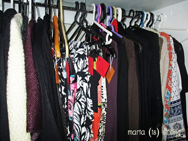 Tärkeänä osana hengarikaapin tyhjennystä oli sinne jäävien järjestely. Vaikka siivoaminen ei kuule lempiasioihini, niin tavaroiden järjestely on aivan toinen juttu. Rrrrrrakastan järjestelyä, laputtamista ja listojen tekoa. Vaatekaapin hyllyjen reunoissa on jo pitkään ollut laput, mitä sillä hyllyllä on. Nyt laitoin hengarikaapin melkein jokaiseen hengariin lapun, mitä sillä roikkuu. Näin näen nopeammalla vilkaisulla, mitä oikeasti omistan. Toivon, että tämä vähentää uusien vaatteiden ostamista ja myös sitä, että vaate palaa pesusta oikealle paikalle. Tosiasiassa pärjäisin kymmenellä vaatekappaleella, mutta sen luokan karsiminen tuntuu nyt liian radikaalilta. Ehkä sekin aika koittaa jossain vaiheessa. Nyt taidan kuitenkin haastaa itseni edes puoleksi vuodeksi olla ostamatta yhtään vaatekappaletta (tästä poikkeuksena sukat ja alusvaatteet). Who’s in?