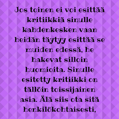 Me emme voi vaikuttaa olosuhteisiin tai siihen, miten toiset ihmiset puhuvat meille tai kohtelevat meitä. Jokainen on elämänsä aikana kokenut ainakin kerran ikävän kommunikaatiotilanteen. Toiset kokevat niitä päivittäin. Vaikka emme voi vaikuttaa aina muihin (joskus positiivinen esimerkki saattaa auttaa tuleviin kommunikaatiotilanteisiin) meillä on kuitenkin valta vaikuttaa siihen, miten otamme toisen loukkaavat sanat tai puhetyylin vastaan ja miten käsittelemme sen. Joskus toiselle voi kertoa että heidän sanansa tai puhetyylinsa loukkasi meitä – joskus se ei hyödytä. Meidän omat reaktiomme ja asioiden prosessointi on ainoita asioita tässä maailmassa, mihin voimme vaikuttaa. Olen koonnut alle inspiroivia ajatuksia, mitä ikävissä kommunikaatiotilanteissa kannattaa pohtia. (niihin, joihin on selvästi löytynyt ihminen ajatuksen takana, on se merkitty. Monet ajatelmista on usean tunnetumman ihmisen lausumia)