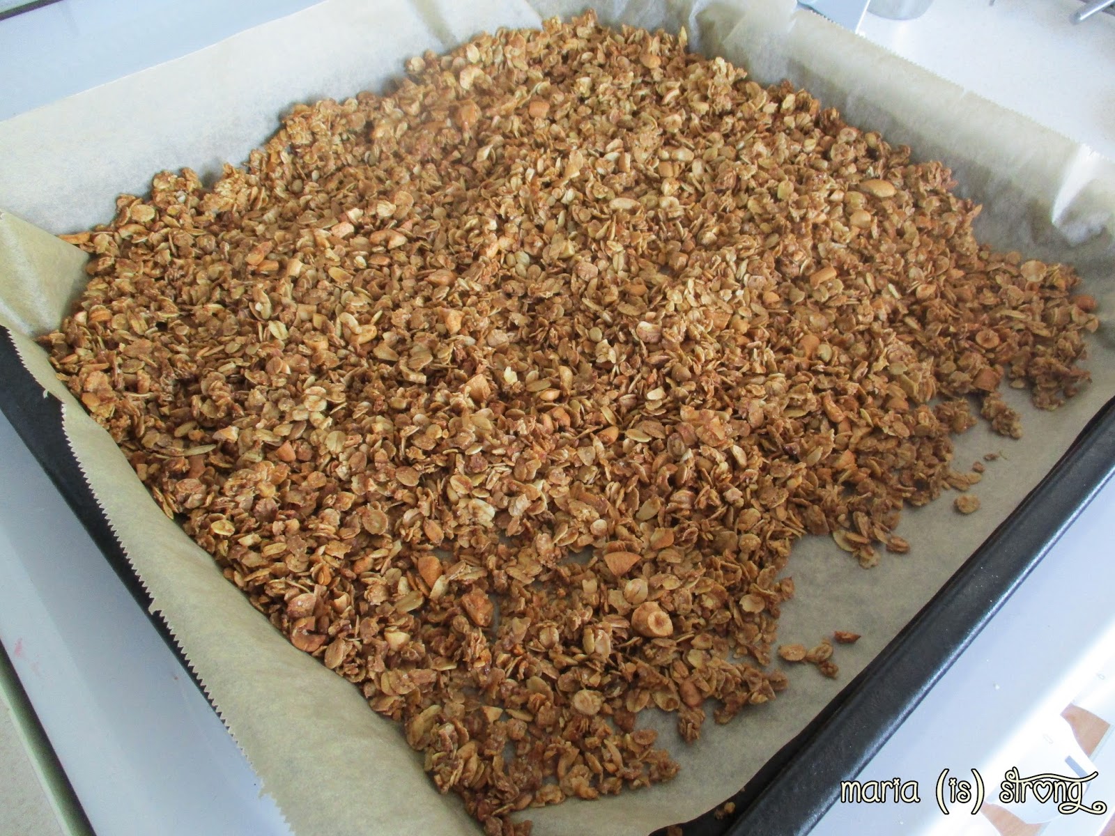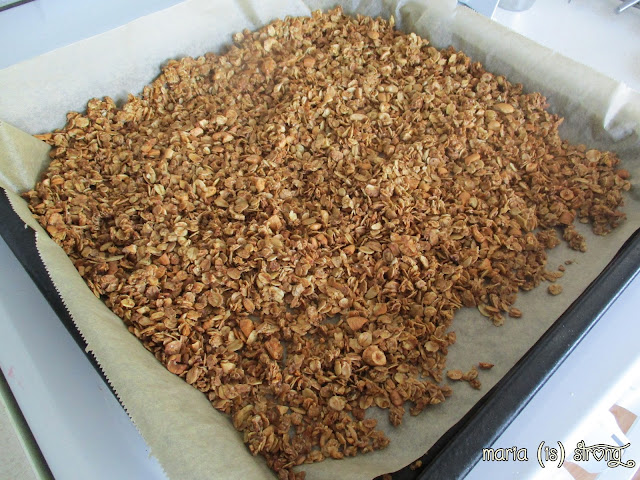 Ruokakaapista löytyi hieman alle desi kookosöljyä, jonka sulatin. Nakkasin sekaan puolisen desiä vaahterasiirappia ja saman verran ruokosokeria. Ei kun kaikki sekaisin, leivinpaperin päälle ja uuniin. Uunissa pöperö oli parikymmentä minuuttia, asteita 175C, jonka aikana kääntelin sitä lastalle useampaankin kertaan. Granolani olisi ehkä saanut jäädä hieman vaaleammaksi, mutta menee tällaisenakin.