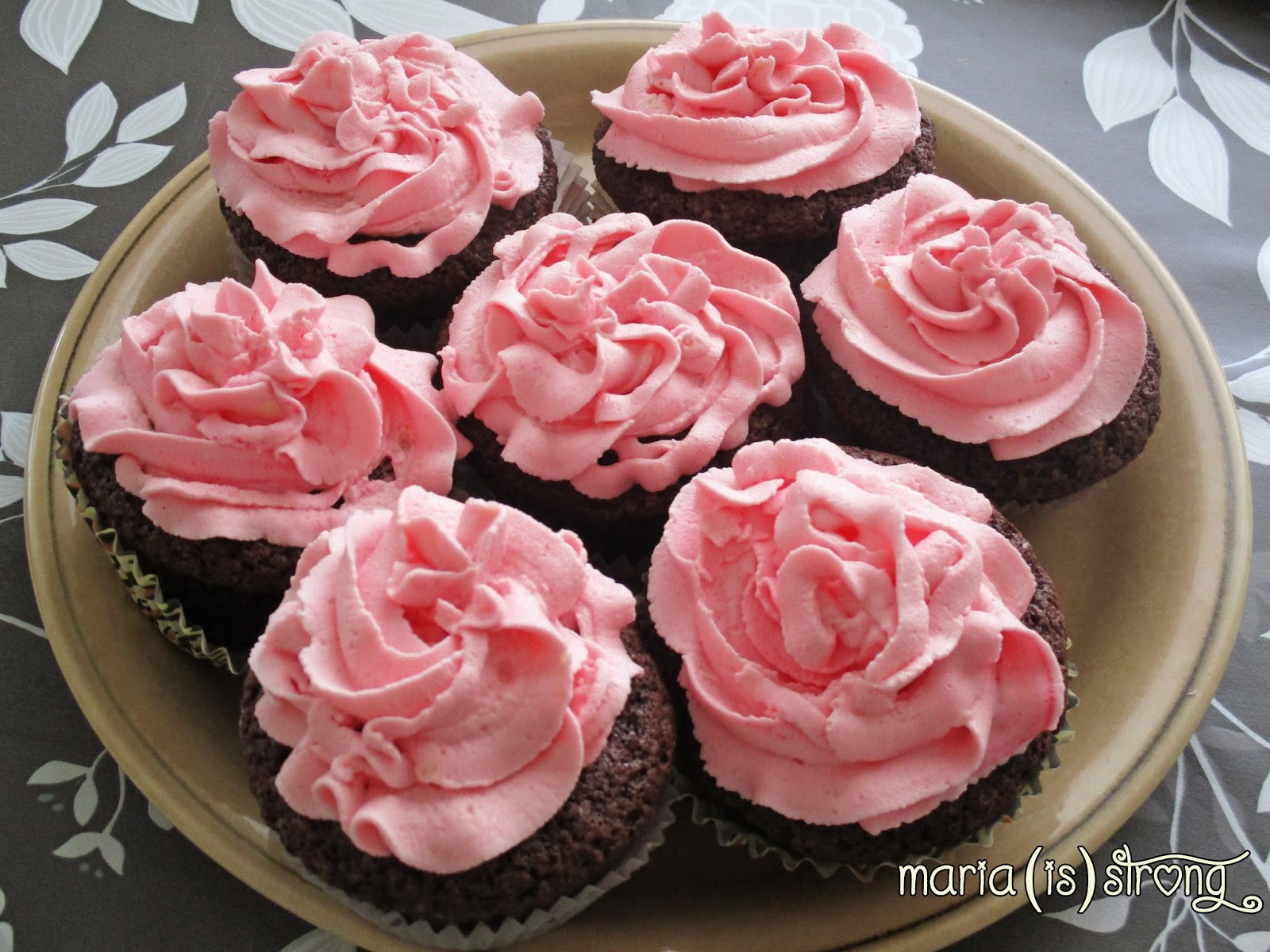 Leivomme kuppikakut sulassa sovussa. Kuopus on kyynärpäitä myöten taikinassa kulhon nuolemisen jälkeen. Vaaleanpunainen väri ei sovi suklaakuppikakkuihin sitruunatuorejuustokuorutteella, mutta mitä väliä sillä oikeasti on? Ei yhtikäs mitään. Pääasia, että teimme vaaleanpunaisia kuppikakkuja.