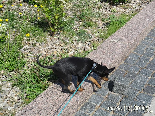 Enkku-poikamme (tässä tapauksessa siis englanninkääpiöterrieripentumme, vaikka nimitystä voisi kyllä käyttää puolisostanikin) oli mukanamme ihmettelemässä suurta maailmaa ja ihmisiä. Äidin ja lasten kivutessa portaat torniin molemmat enkkulaiset odottelivat maan kamaralla.