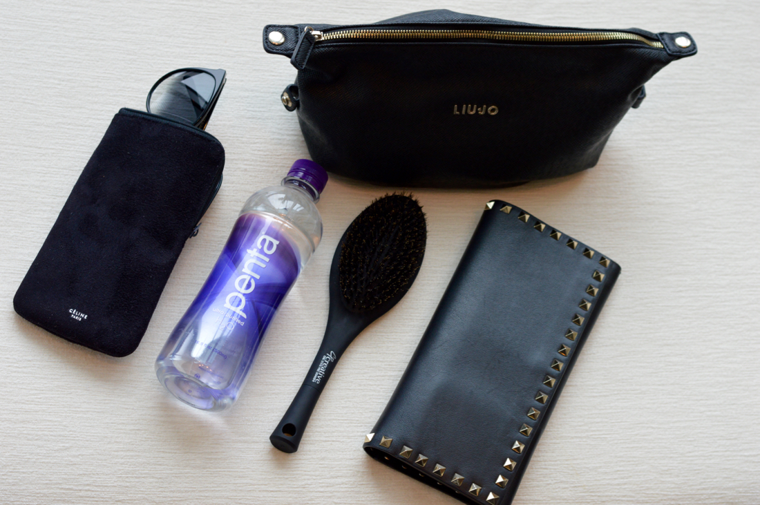 Käsilaukustani löytyy aina meikkipussi, hiusharja, vesipullo, aurinkolasit, veteen sekoitettavia vitamiinijuomia, proteiinipatukka, purkkaa, pastilleja ja käsipyyhkeitä.
