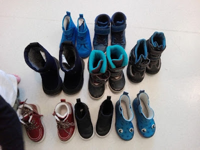 Lounastelun jälkeen taas touhusimme aikamme mm. leikkikeittiön ja pallon parissa. Sitten vetelimme pari tuntia päiväunia, tai no Leo veteli ja minä makoilin sängyssä pohtien syntyjä syviä. Herättyämme paistoimme Leolle lisää poro-pyöryköitä, basilikalla maustettuna. Sekä laitoimme lakanoita kuivumaan. Seuraavaksi kiskoimme ulkovaatteet niskaan ja lähdimme hakemaan Leolle muutamia vaatteita – kengät sekä toppatakki. Takkia emme olisi tarvinneet, mutta se oli vaan ihana..