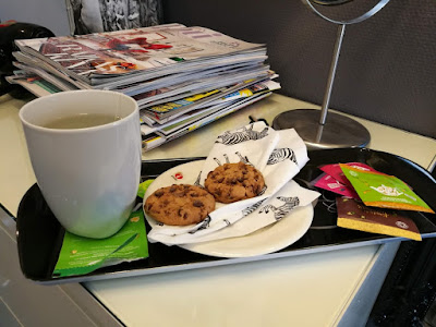 Värit päässä odottelu on aina yhtä tylsää, ainakin minun kaltaiselleni “en pidä lainkaan turhasta paikallaan istuskelusta edes vapaapäivänä ja omalla hengähdystauollani”. Onneksi tarjolla oli kuitenkin teetä ja keksejä, joten jopa minun aikani kului ihan kivasti odotellessa. Itse olen aina vihannut värin pesua yli-kaiken; se asentokin on niin epämukava! Tällä kertaa se kuitenkin oli yksi parhaita osuuksia koko käynnillä; tuntui kuin olisi saanut päähieronnan samaan hintaan mukaan.