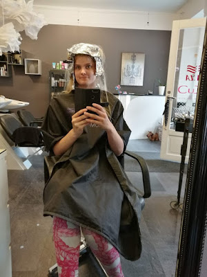 Tuoliin istuessani tajusin, ettei minulla ollut mitään visiota siitä, mitä hiuksiltani tahdoin. En ollut enää varma edes siitä tahdoinko lyhyen vai pitkän mallin tai halusinko vaaleaa vai punaista hiusta. Onneksi kampaajalta löytyi nopeasti oma visionsa ja se kuulosti hyvälle minunkin korvaani. Kampaaja aloitti laittamalla raitoja hiuksiini, joilla oli tavoitteena saada väriä ja luonnollisuuden näköisyyttä hiuksiin.