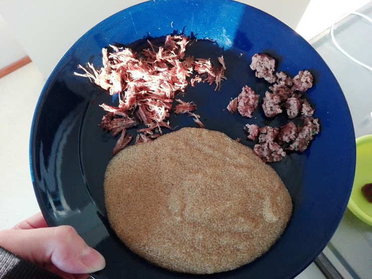 Uusimpana tuttavuutena ruokavalioon on tiensä löytänyt Uuden seelannin lammas. Sitä valmistin uunissa, matalassa lämmössä piiiiitkään paistaen. Nyhtö-lammasta? Leo innostui, kuin sai vaihtelua lihaan ja tuo näyttäisi sopivan. Pidetään peukkuja, ettei kaadu ruokavaliosta.
