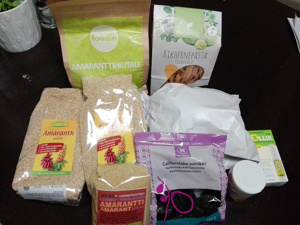 Ruohonjuuresta amaranttihiutaleita, amarantti-muroja, lisukkeena toimivaa amaranttia sekä kikhernepastaa (lähtee aivan uutena kokeiluun lähipäivinä!). Lisäksi sieltä mukaan tarttui D-Lux eli D-vitamiini, josta otetaan suihkaus ja se on siinä. Pitäisi olla suolisto ystävällinen jne, kun Leolla ei vieläkään sopivaa D-vitamiinia löydy, vaikka se kuinka suotavaa olisi..