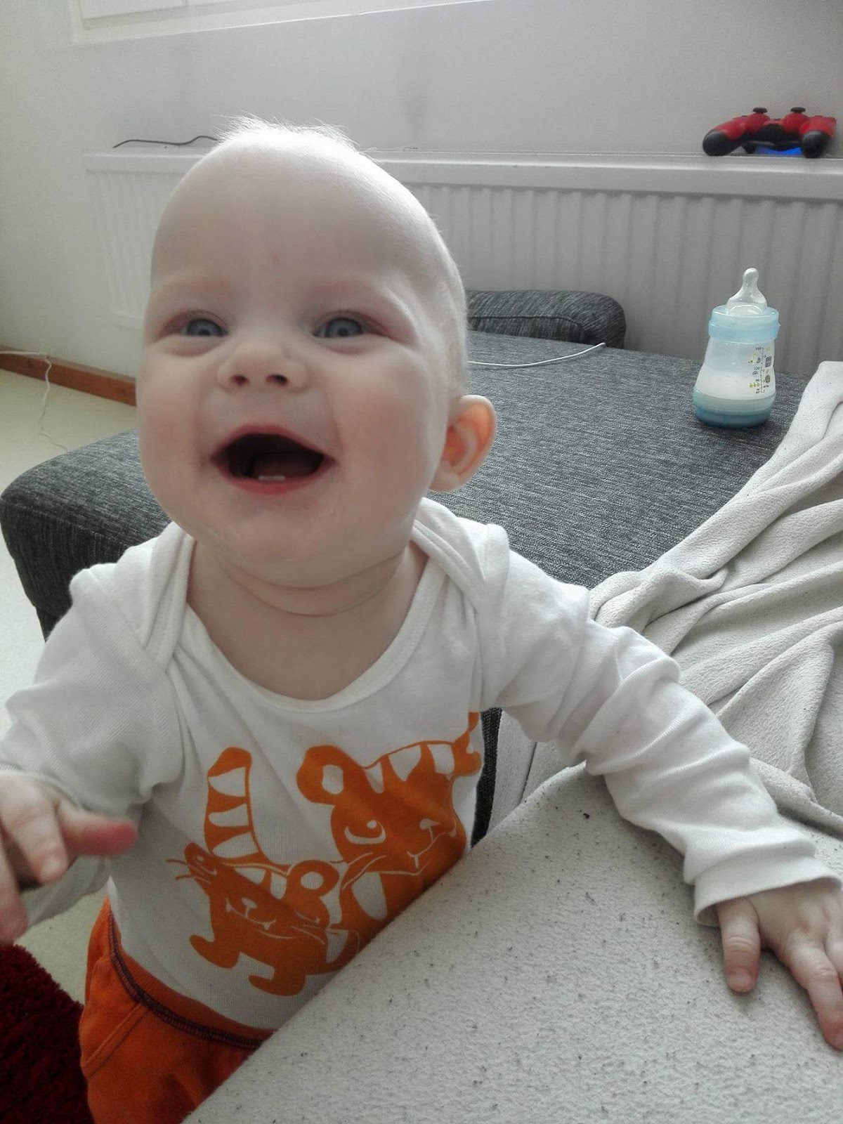 Kaksi hammasta on tullut läpi ja ilmeisesti ylös odotellaan seuraavia kun ikeniä katsoo. On nuo pienet valkoiset hampaat vain jotain niin suloista! Toisaalta haikeaa – ei ole enää pientä hampaatonta vauvaa tässä taloudessa vaan iso poika kera kahden pienen hampaan. Kovasti opetellaan kävelyä pöytää ja sohvaa vasten ravaten päästä toiseen, kontataan ympäri asuntoa ja tutkitaan aivan jokainen paikka. Suihkussa käydessä ja syödessä tuo täystuho on laitettava istumaan syöttötuoliin, koska muuten ei tule mitään. Aivan kaikki menee suuhun – leluista sohvaan. Leluilla voi leikkiä vasta, kun niitä on maistettu ja niitä täytyy maistella myös kesken leikin. Ihan parasta on, kun joku rakentaa palikoista rakennelman ja sen saa kaataa ja dublotkin on hauskoja.