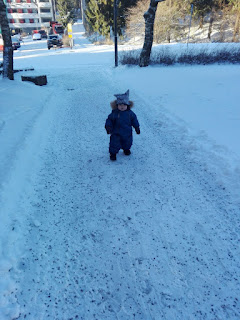 Haalarilla on kokoa, mutta ei se mikään hullun iso ole, vaikka 92cm onkin! Hyvin sillä alkaa jo kävelykin sujumaan 🙂 Olemme nyt ulkoilleet pari päivää Kuomissa, vaikka en niitä parhaimpina pidäkään jalalle.. Mutta ne ovat pitäneet nyt varpaaat lämpimänä ja se lienee se tärkein asia tässä kohti!