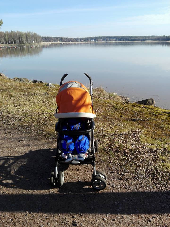Täällä on merenranta aivan vieressä ja siitepöly-allergiasta huolimatta siellä tallustelee ihan mielissään ja nukuttaa väsynyttä vauvaa. Varsinkin nyt, kun ilma on heti aamusta asti aurinkoinen ja lämmin. Ei yhtään hullumpaa!