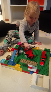 Klo 11.30 duploilla linnan rakentelua, kun odoteltiin ruoan valmistumista. Tällä hetkellä yksi suurimpia intohimoja on linnojen rakentelu duploista; kotona sekä päiväkodissa! Ruokana oli tavalliseen tapaan hirssiä sekä possun suikaletta kaurakermalla ja lasissa tilkka kauramaitoa.