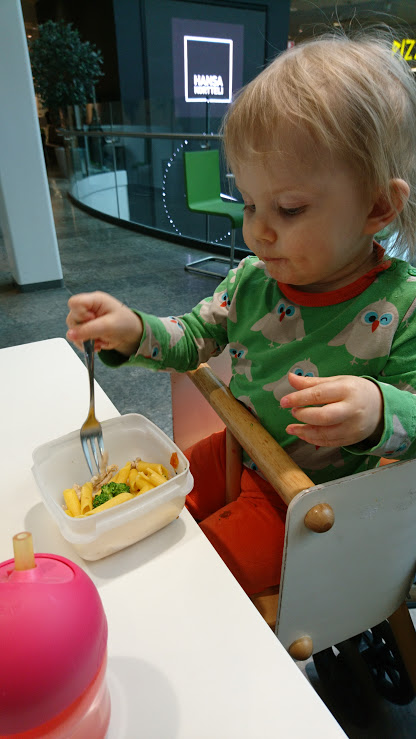 Ruoka oli maistunut, mutta leikkipaikalle oli meinannut tulla kiire. Lopulta poika oli laittanut Mumman syöttämään, jotta touhu sujuisi nopeammin ja pääsisivät leikkimään. Ja pakko todeta, että kotiin tuli niin puhtaissa vaatteissa poika, etten meinannut uskoa hänen syöneen yhtään mitään koko reissun aikana! Kovin minulle kuitenkin vakuuteltiin, että ruoka oli maistunut ja kaikki mennyt.