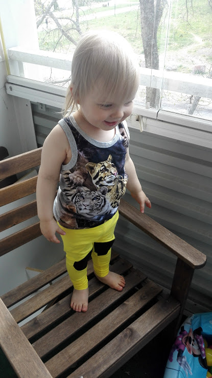Jos Leolta kysytään, niin ehdoton suosikki on tämä Molon “kissa”-paita. Minäkin pidän tästä kovasti, mutta Leo pitää tuplasti enemmän. Tämä oli ainoa, jonka hän olisi halunnut jättää päällensä ja jota hän kovasti osoitteli, kun kaivoin paketista esiin 🙂 Ja tämä on niitä harvoja paitoja, jotka laitetaan enemmän kuin mielellään päälle ja aina nähdessään hän on valmis pukeutumaan/vaihtamaan paitaa. Saman kuosin haalaria olen monesti katsonut, mutta aina se on saanut jäädä kauppaan. Nyt kompromissina kesälle sitten toppi. Tämä on hiukan isoa kokoa, mutta käytettävissä ja kesällä varmaankin juuri eikä melkein.