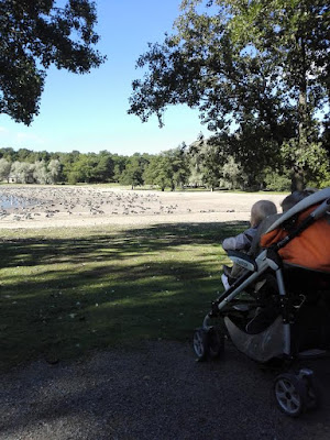 Muutama hanhikin tosiaan oli pysähtynyt rannalle.. Koko ranta aivan täynnä niitä! Leokin katseli, ihmetteli ja osoitteli hanhia ihmeissään 🙂 Niin söpöä!